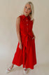 **Why You'll Love It** - Sleeveless silhouette with wide pointed collar - Gold-tone button-front placket - Self-tie sash at the natural waist — removable - Midi length, falling just below the knee - Lightweight, breathable fabric - Available in Chambray and Red